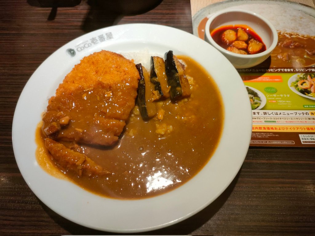 富裕層向け高級カレー専門店CoCo壱へ。チキンカツカレー、揚げナスハーフ、うま辛ニンニク。